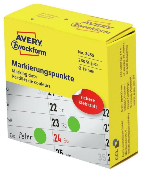 A zöld színű, öntapadó jelölőpontok 3855-ös cikkszámmal, 19 mm átmérőben az Avery Zweckformtól mostantól praktikus adagolódobozban is elérhetőek. Ideális megoldás jelölésre, rendszerezésre, csoportosításra, tervezés elősegítésére, feladatok priorizálásának színjelölésére. 250 darab kör alakú jelölőcímke egy dobozban. Az adagolódoboz kényelmes és egyszer