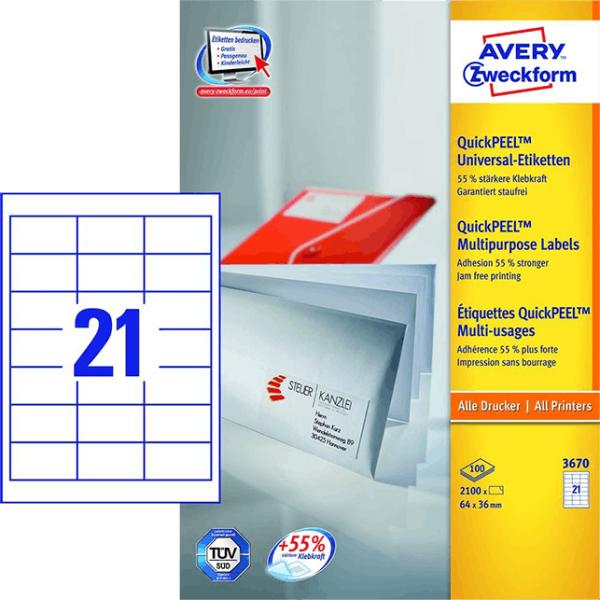 Az Avery Zweckform 3670 cikkszámú általános felhasználásra szánt A4-es íves címkéje! Matt papír alapanyagú, normál ragasztóval, mely széles hőmérsékleti tartományban használható. A papír öntapadó címke kültéri hatásoknak nem, vagy csak korlátozottan áll ellen. Az Avery Zweckform íves öntapadó etikett címkéivel kiváló nyomtatási eredmény érhető el, bármilye