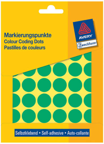 Az Avery Zweckform 18mm átmérőjű, Zöld színű jelölőcímkéi általános célú papír alapanyagból, Normál ragasztóval készülnek. Tökéletes megoldást jelentenek azonosításhoz, jelöléshez (ESD jelölő) raktározásnál és gyártásnál. A jelölőcímkék nem nyomtathatóak és nem fénymásolhatóak, kizárólag kézzel írhatóak és helyezhetőek fel. Egy csomagban 1056 ö