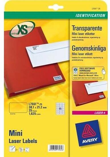 Avery Zweckform L7551-25 cikkszámú, átlátszó, poliészter címzés címkék 38,1x21,2 mm méretben. Kiválóan alkalmasak például a feladó címének feltüntetésére, akár kiváltva ezzel az előnyomott borítékokat. A csomag tartalma: 1000 címke/ 25 ív. Az átlátszó címzés etikettek felragasztás után gyakorlatilag láthatatlanok lesznek, ezáltal nagyszerűen alkalmazható vil