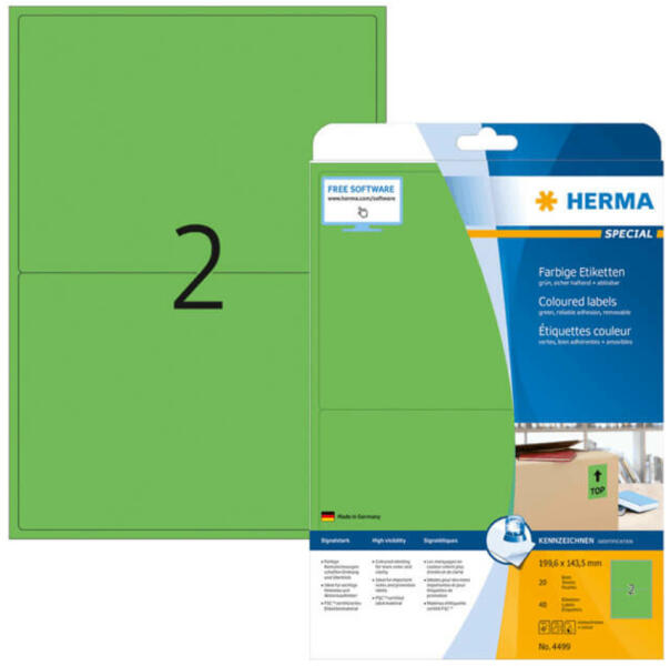 199,6*143,5 mm-es Herma A4 íves etikett címke, zöld színű (20 ív/doboz) A Herma vállalat több évtizedes tapasztalatának és folyamatos minőségellenőrzésének köszönhetően prémium minőségű etikett címkéket, valamint öntapadó alapanyagokat gyárt íves és tekercses kiszereléshez egyaránt. A Herma több száz féle felhasználásra gyárt öntapadó etikett címkéket, mel