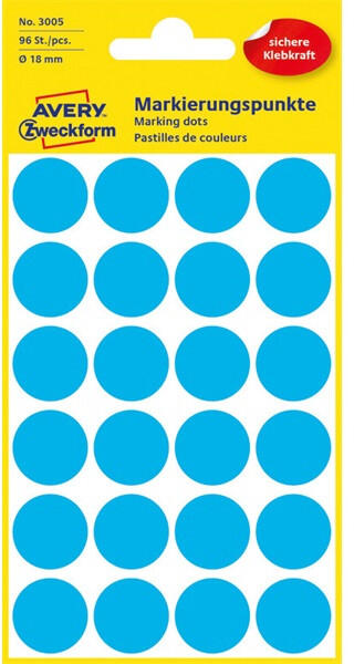 Avery 3005 18mm 96db-os kék jelölőpont Címke mérete: 18 mm Csomag tartalma: 96 jelölőpont/csomag Címke színe: kék Nyomtatható: Kézzel írható, kézzel feliratozható. Nyomtatóval nem nyomtatható! Leírás: - öntapadó jelölőcímke, permanens ragasztóval - ideális azonosításhoz, jelöléshez - hibajelölő címkeként is használható