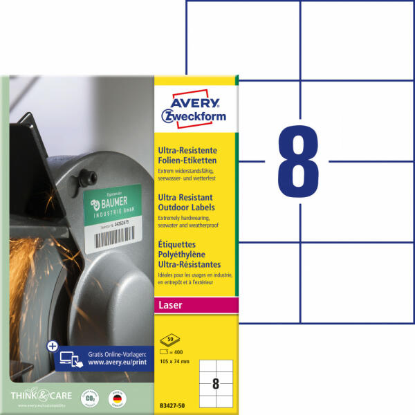 Címke mérete: 105 x 74 mm Avery Zweckform 105 x 74 mm méretű, fehér színű, matt felületű, időjárásálló, rendkívül ellenálló öntapadós etikett címke, A4-es lapon, erős, tartós ragasztóval, hegyes sarkokkal, valamint garantált elakadásmentes nyomtatással. Rendelési azonosító: Avery Zweckform B3427-50 . Nyomtatható: fekete-fehér és színes lézernyomtatókban, valamin