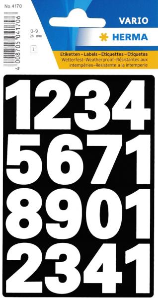 Herma Vario No. 4170 fehér színű, időjárásálló, matt felületű, öntapadó számmatrica azonosításra, címkézésre, jelölésre, feliratozásra. Mivel időjárásálló, ezért kültéren is felhasználható. A csomag összesen 16 darab külön-külön leválasztható, háttér és keret nélküli számmatricát tartalmaz. Karakterek: számok 0-tól 9-ig. Karakter magassága: 25 mm Kar