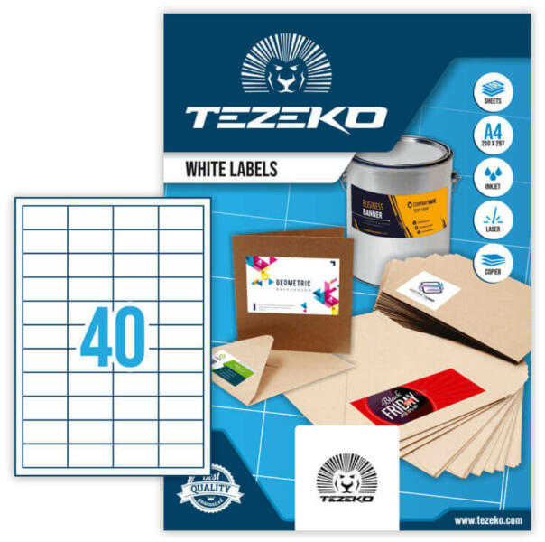 A 48,5*25,4 mm Tezeko A4 íves etikett címke főbb jellemzői: A Tezeko professzionális gyártási technológiával és folyamatos minőségellenőrzés mellett prémium minőségű etikett címkét gyárt. Az első ránézésre azonosnak tűnő íves öntapadó etikett címkék között óriási különségek lehetnek, ami a nyomtatók és fénymásolók élettartamát kedvezőtlenül befolyás