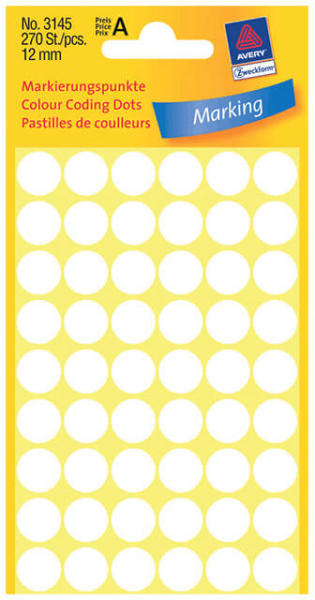 Az Avery Zweckform 12mm átmérőjű, Fehér színű jelölőcímkéi általános célú papír alapanyagból, Normál ragasztóval készülnek. Tökéletes megoldást jelentenek azonosításhoz, jelöléshez (ESD jelölő) raktározásnál és gyártásnál. A jelölőcímkék nem nyomtathatóak és nem fénymásolhatóak, kizárólag kézzel írhatóak és helyezhetőek fel. Egy csomagban 270 ö