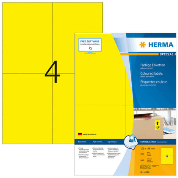 105*148 mm-es Herma A4 íves etikett címke, sárga színű (100 ív/doboz) A Herma vállalat több évtizedes tapasztalatának és folyamatos minőségellenőrzésének köszönhetően prémium minőségű etikett címkéket, valamint öntapadó alapanyagokat gyárt íves és tekercses kiszereléshez egyaránt. A Herma több száz féle felhasználásra gyárt öntapadó etikett címkéket, melye