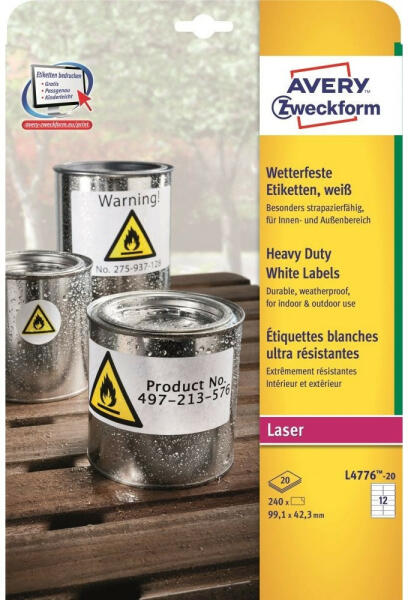 Címke mérete: 99,1 x 42,3 mm Doboz tartalma: 240 darab címke - 20 ív/doboz (12 címke/ lap) Strapabíró poliészter időjárásálló címkéi lézernyomtatókhoz, kifejezetten kültéri használatra készültek. Az erős, tartós tapadású ragasztónak köszönhetően tökéletesen időjárásálló, megbízható és tartós. A strapabíró, poliészter filmből készült etikettek olaj, sz