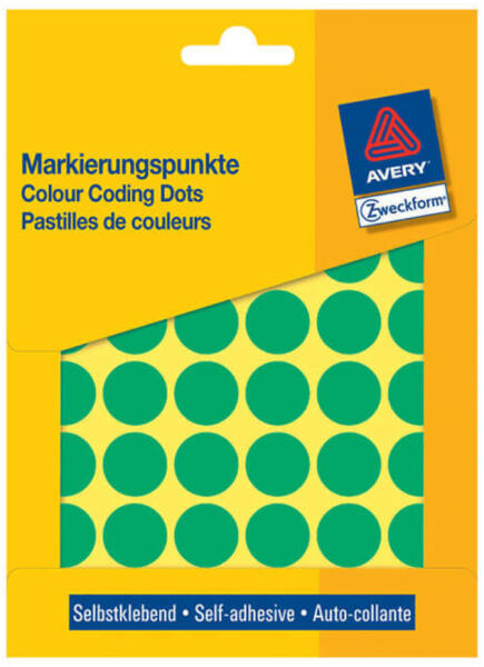 Az Avery Zweckform 18mm átmérőjű, Zöld színű jelölőcímkéi általános célú papír alapanyagból, Normál ragasztóval készülnek. Tökéletes megoldást jelentenek azonosításhoz, jelöléshez (ESD jelölő) raktározásnál és gyártásnál. A jelölőcímkék nem nyomtathatóak és nem fénymásolhatóak, kizárólag kézzel írhatóak és helyezhetőek fel. Egy csomagban 1056 ö