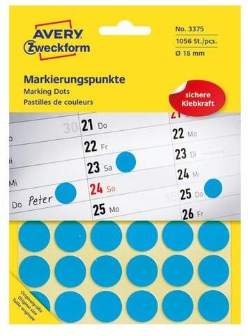 Etikett kék jelölő címke Avery Zweckform, 3477 cikkszámú. Méret: 18 mm átmérőjű, A/4-es íveken. Kiszerelés: 1056 címke/doboz, 22 ív/doboz. Permanens ragasztóval ellátott, biztonságos tapadás. Kézzel írható!