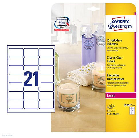 Víztiszta etikett címkék. Ezek a különleges etikettek magasfényű, kristálytiszta anyagból készültek, melyek stílusos megjelenést és tökéletes láthatóságot biztosítanak a termékeknek, irodai eszközöknek. Fényes anyagának köszönhetően tökéletes üvegen, fényes felületeken, műanyagon és fémen egyaránt. Olaj-, szennyeződés- és hőálló (-20°C - +80°C) , csepp