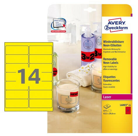 Etikett címke Avery Zweckform 99.1x38.1 mm lézer címke visszaszedhető neon sárga 25 ív 350 db/csomag L7263Y-25 * Neon címkék a maximális figyelemfelkeltés eléréséhez * Erős tapadás, mégis nyom nélkül eltávolítható * Különböző formák és színek, a világító neon színekkel speciális, figyelemfelkeltő megjelenés