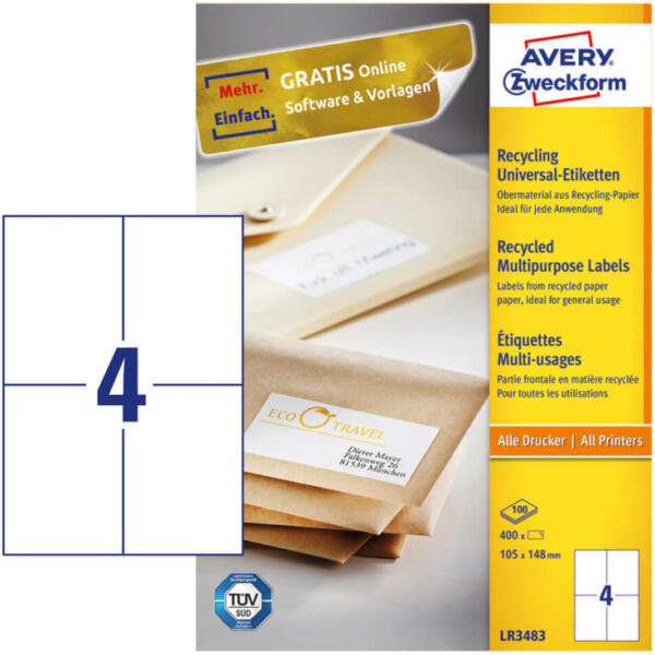 Újrahasznosított papírból készült (környezetbarát) az Avery Zweckform LR3483 cikkszámú, általános felhasználásra szánt A4-es íves címkéje!Matt papír alapanyagú, normál (vízbázisú) ragasztóval, mely széles hőmérsékleti tartományban használható. A papír öntapadó címke kültéri hatásoknak nem, vagy csak korlátozottan áll ellen. Az Avery Zweckform íves öntapad