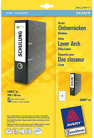 Az Avery Zweckform fehér, öntapadó L6061-100 kódszámú 59x192mm méretű iratrendező címke (keskeny/hosszú) megbízhatóan tapad minden általános széles iratrendezőre, mint pl. from Elba, Esselte és Herlitz. Az innovatív Ultragrip technológiának köszönhetően biztosított a hajszálpontos lapbehúzás és az elakadásmentes nyomtatás. A lézernyomtatókban történő problémame