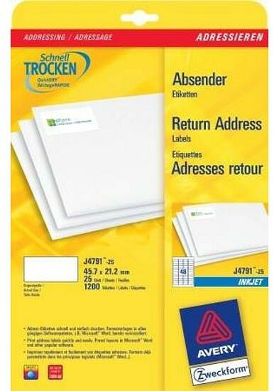 Avery Zweckform J4791-25 cikkszámú, fehér címzéscímkék. Ezek a speciális bevonattal rendelkező etikett címkék, 45,7x21,2 mm méretben tökéletesen alkalmasak például feladócímkék készítésére. A csomag tartalma: 1200 címke/25 ív. Az egyedülálló QuickDry technológiának köszönhetően tökéletes, elkenődésmentes eredmény a nyomtatás során. Kifejezetten a tintasugara