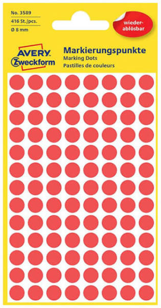 Az Avery Zweckform 8mm átmérőjű, Piros színű jelölőcímkéi általános célú papír alapanyagból, Visszaszedhető ragasztóval készülnek. Tökéletes megoldást jelentenek azonosításhoz, jelöléshez (ESD jelölő) raktározásnál és gyártásnál. A jelölőcímkék nem nyomtathatóak és nem fénymásolhatóak, kizárólag kézzel írhatóak és helyezhetőek fel. Egy csomagban