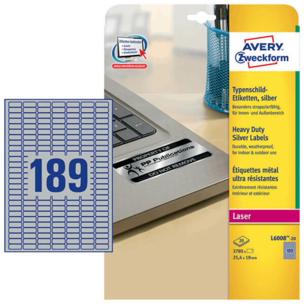 25,4*10 mm-es Avery Zweckform A4 íves etikett címke, ezüst színű (20 ív/doboz) A németországi Avery Zweckform több évtizedes tapasztalatának és folyamatos minőségellenőrzésének köszönhetően prémium minőségű etikett címkéket gyárt. Az Avery több száz féle felhasználásra gyárt öntapadó A4-es etikett címkéket, melyek a legkülönlegesebb felhasználási igényeket