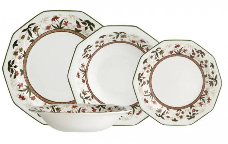Gyártó: Churchill Modell: Assam kerámia étkészlet, 19 részes (407158) Leírás: 6 darab lapos tányér 26 cm 6 darab mély tányér 20 cm 6 darab desszert tányér 20 cm 1 darab salátás/leveses tál 25,5 cm Mosogatógépben és mikróban használható.