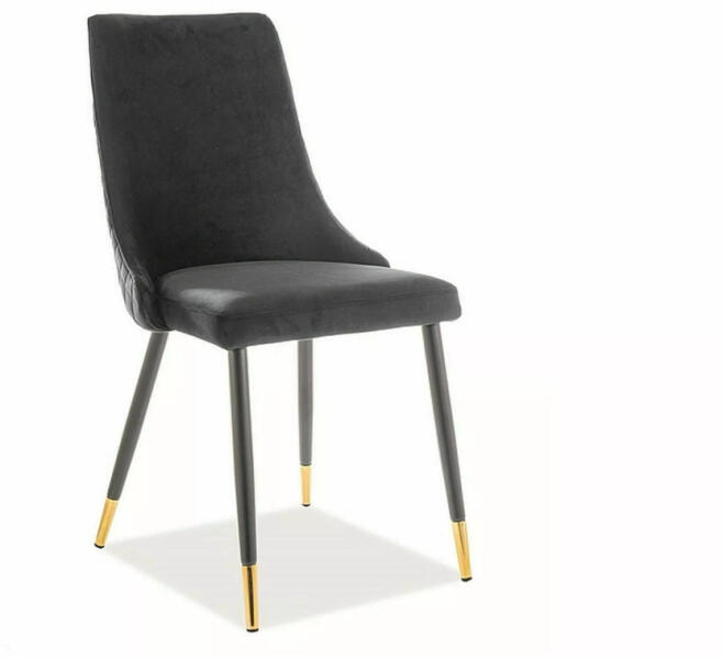Elegáns Piano bársony étkezőszék, amely ötvözi a luxust és a kényelmet. A fekete bársony kárpitozás és az arany díszítésű fekete fém váz tökéletes összhangot teremt, míg a háttámla rombusz mintázata különleges megjelenést kölcsönöz. Elegáns kényelem modern stílusbanA Piano Luxus bársony étkezőszék a modern elegancia és kényelem tökéletes ötvözete. A fek