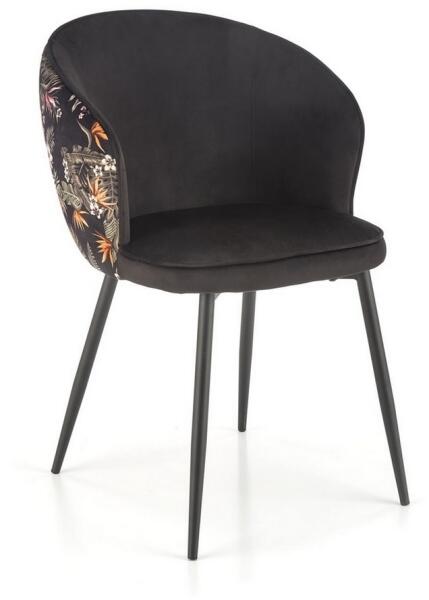 Nathan étkezőszék A Nathan széket mindenkinek ajánljuk, aki egy kicsit különlegessé szeretné tenni a belső terét. Különösen egyedi a mintás huzatával, amely hangulatosabbá teszi étkezőjét. Az ülőfelület és a háttámla a mintához hasonló puha szövettel van kárpitozva. bársony. Hátát színes virágmotívum díszíti. A lábak fekete porszórt acélból készülnek. Ez