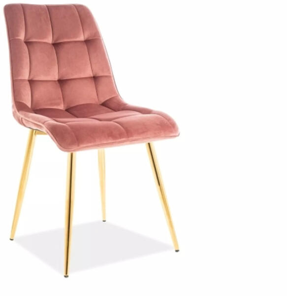 Elegáns bársony étkezőszék steppelt kárpitozással és arany színű fém lábakkal. A puha, rózsaszín bársony kárpitozás és a modern dizájn tökéletes kombinációja luxus megjelenést kölcsönöz otthonának. Luxus és kényelem találkozása modern kivitelbenA Chic Elegance étkezőszék a modern luxus megtestesítője. A puha, rózsaszín bársony kárpitozás és az arany szín