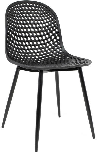 Modern és sokoldalú Chips szék fekete matt polipropilén ülőrésszel és dekoratív áttört mintázattal. A fekete fém lábszerkezet tökéletesen kiegészíti az ergonomikus kialakítású ülőfelületet, így stílusos és kényelmes ülőbútort kínál otthonába vagy irodájába. Modern dizájn és kényelem egy székbenA King Home Chips szék tökéletes példája a modern formaterve