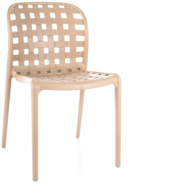 Modern, fonott mintázatú PP műanyag szék bézs színben. Praktikus és stílusos választás éttermekbe és kávézókba, köszönhetően a rakásolható kialakításnak és a tartós anyaghasználatnak. Modern és praktikus rakásolható szék fonott mintázattalA Strip szék egy innovatív dizájnnal rendelkező ülőbútor, amely teljes egészében PP műanyagból készült. A szék hátt