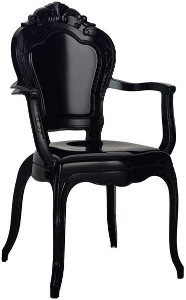 King Arm fekete szék. Modern és elegáns forma Glamour stílusban. A szék teljes egészében tartós műanyagból (polikarbonát) készült, nagy teherbírással (125 kg-ig), ütésállósággal és ami a legfontosabb, könnyűséggel (5,2 kg). Az átlátszó anyagnak köszönhetően a szék optikailag nem foglalja el a helyet. Nagy előnye, hogy a szék egymásra rakható, így könnyen rakhat