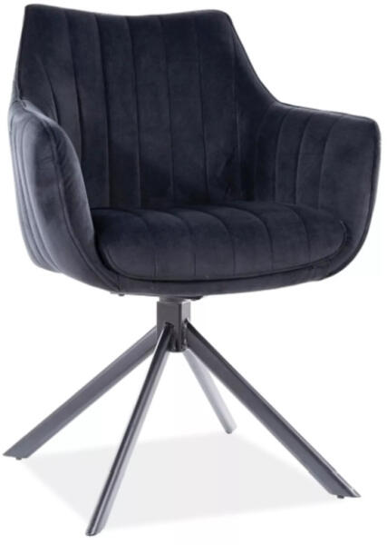 Modern, forgó étkezőszék fekete bársony kárpitozással és matt fekete fém vázzal. 180 fokos forgási képességgel és automatikus visszatérési funkcióval rendelkezik, amely tökéletes kombinációja a kényelemnek és a funkcionalitásnak. Elegáns kényelem és modern dizájn találkozásaAz Azalia Velvet forgószék a modern otthonok tökéletes kiegészítője. A fekete bársony k