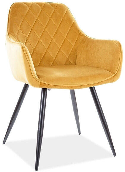 Elegáns kényelem modern stílusban A Linea Velvet étkezőszék a modern design és a kényelem tökéletes ötvözete. A curry színű bársony kárpitozás luxus megjelenést kölcsönöz, míg a rombusz mintázatú háttámla egyedi karaktert ad a széknek. A matt fekete fémlábak stabil alapot biztosítanak és harmonikusan illeszkednek a szék dizájnjához. A karfás kialakítás extra k