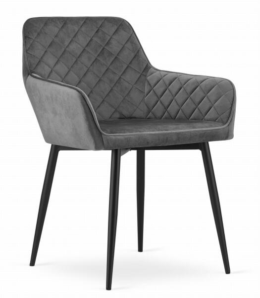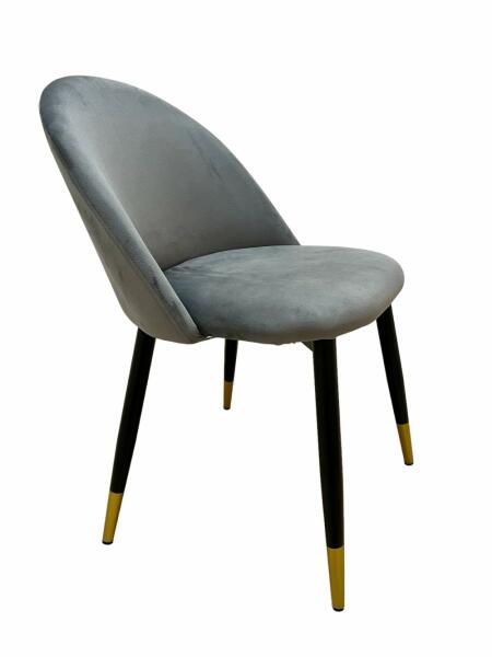 Ünnepélyes megjelenésű rendkívül elegáns étkezőszék. A szürke bársony kárpitozás puha, kényelmes időtöltést tesz lehetővé akár órákon át. Lábai fekete porfestett fémből készültek, aranyszínű lábvéggel, amely még elegánsabbá teszi a széket. A széklábak csúszásgátlóval lettek ellátva melyek a padlót is védik a használatból eredő karcolásoktól. Rakt