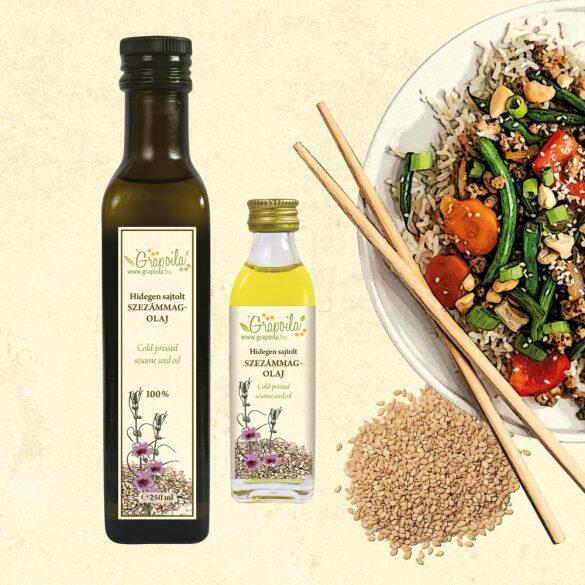 Grapoila Szezámmagolaj 250ml A Grapoila Szezámmagolaj világossárga szín és jellegzetes szezámillat jellemzi. A keleti konyha egyik legfontosabb alapanyagaként ismert. Magas lecitintartalma miatt jótékonyan hat az idegrendszerre, használatával bőrünk épségét is megóvhatjuk. Mákliszttel és mákolajjal együtt alkalmazva segít a csontritkulás megelőzésében. Füstpontja magas,
