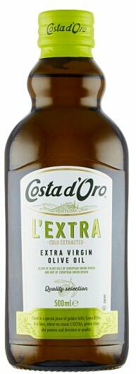 Costa d'Oro Extra szűz olívaolaj 500ml Közvetlenül olajbogyóból kizárólag mechanikai módszerekkel nyert olívaolaj válogatott minősége. Táplálkozási értékek 100 ml termékenként Energia 3367 kJ - 819 kcal Zsírok 91 g ebből telített zsírsavak 15 g Szénhidrát 0 g ebből cukrok 0 g Fehérjék 0 g Só 0 g Az EU-ban készült.