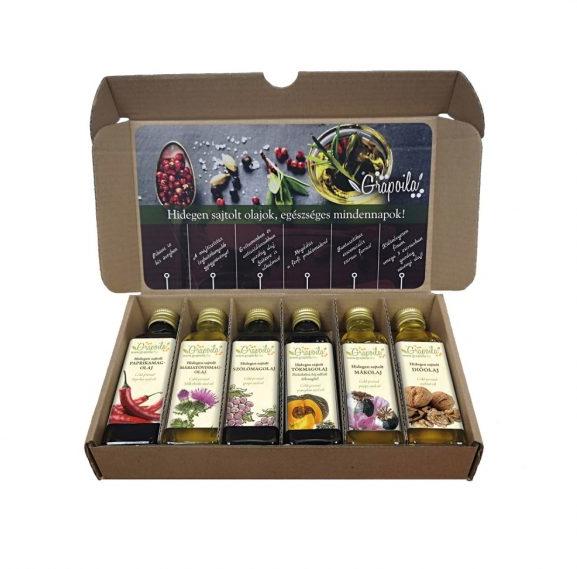 Grapoila - paprikás kóstolódoboz Minden olajunkat egyszerre ritkán tudjuk megkóstoltatni. Ezzel a kóstolódoboz-válogatással mégis egy kisebb ízelítőt kapunk legkülönlegesebb olajainkból. A 40 ml-es üvegekben levő olajokat kipróbálhatjuk salátákhoz, sütéshez, főzéshez, ízesítéshez. A dekoratív doboz ugyanakkor remek ajándék is lehet gourmet beállítottságú, gasztr