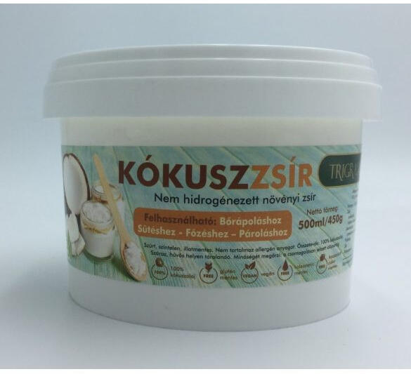 Trigramm kókuszzsír 500 ml Tökéletes sütéshez, főzéshez, illetve bőrálpoláshoz. Nem hidrogénezett termék, nem tartalmaz semmilyen hozzáadott anyagot. Ajánljuk mindenki számára, szinte bármilyen diétába beilleszthető.