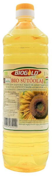Magas olajsavtartalmú (High Oleic) bio napraforgómagból készül, hideg sajtolással, szagtalanítással. 1000 ml-es sütőolaj; Biogold termék sütéshez-főzéshez.