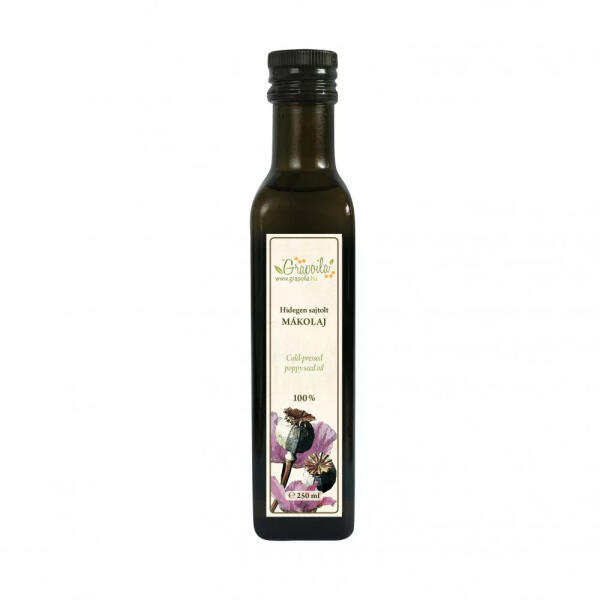 Grapoila Mákolaj Nettó tartalom: 250 ml A Grapoila alapelve, hogy a természetes összetevőből álló, vegyszermentesen előállított élelmiszerek a minőségi táplálkozás alapkövei. Termékeik hidegen sajtolási eljárással készülnek: a hidegen sajtolás kizárólag mechanikai eljárás, melynek során az alapanyagok természetes, értékes összetevői teljes mértékben megőrződn