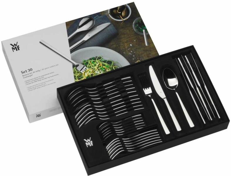 A WMF Atria evőeszközkészlet 30 db tartalma: 6x kanál 6x villa 6x kés 6x teáskanál 6x desszert villa