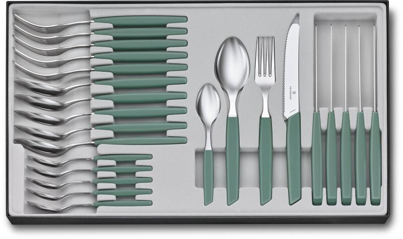 6 db kanál, 6 db villa, 6 db kés, 6 db kávés-/teáskanál, 6 db deszzertes villa