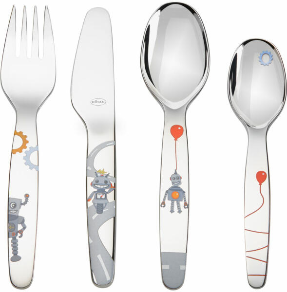 Rozsdamentes acélból készült gyermek evőeszközök: 1x gyermek villa, 1x gyermek kés, 1x gyermek kanál nagy, 1x gyermek kanál kicsi. Alkalmas 3 éves kortól Könnyű tisztítás Mosogatógépben mosható MEGJEGYZÉS: Az evőeszközök nem gyermekjátékok. Kérjük, a sérülések elkerülése érdekében óvatosan bánj vele.