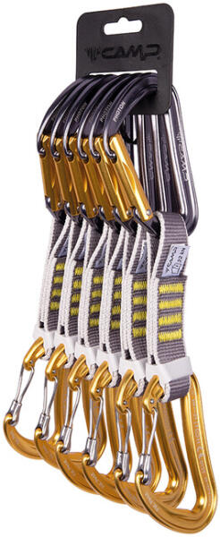 CAMP Dyon és CAMP Photonkarabinerekből álló 6 darabos keverőpréskészlet. A CAMP Photon Straight Gate a világ legkönnyebb teljes méretű karabélya. A Dyon egy szabadalmaztatott drótzárat használ, amely egyesíti a drótzár egyszerűségének előnyeit a teljes zár erősségével. Ez az egyedülálló