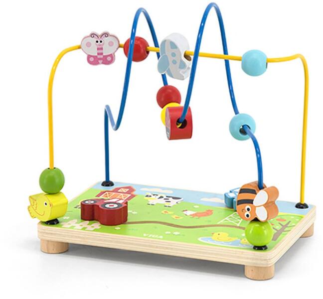 A térbeli labirintus az egyik legnépszerűbb játék az egyévesnél idősebb gyermekek számára. A labirintus színesre festett fa alapja egy farmot ábrázol állatokkal és egy mozgatható traktorfigurával. Az alaphoz két színes, hurokká csavart rúd van rögzítve, amelyekre különböző színes elemek vannak felhelyezve, és amelyek között találsz: pillangót, méhecskét, madarat,