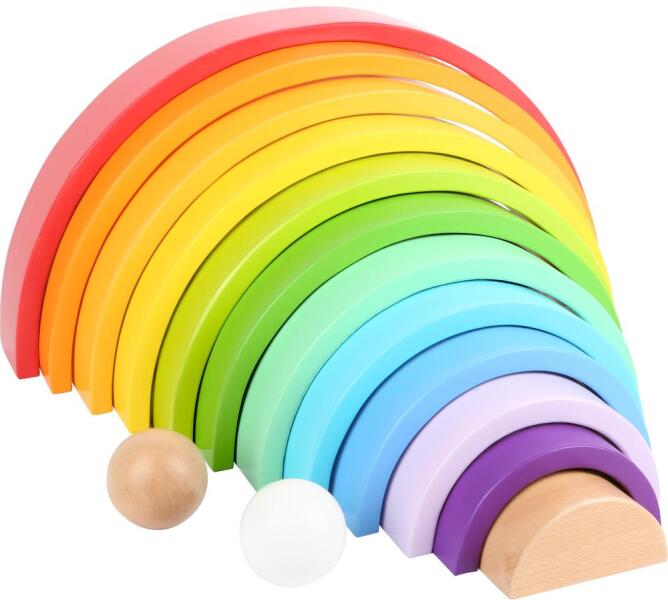 A Small Foot új termék e ez az igényes, szép kivitelezésű, 12-féle színt felvonultató szivárvány fa építőjáték. A 14 darabos készlet félkör alakú, íves részekből áll, melyekből alagút, szivárvány, virágszirom, labirintus, és ki tudja még, mi minden építhető! Például védelmező kerítés a fababáknak, plüssállatoknak! A játék tartozéka még 2 fagolyó is,