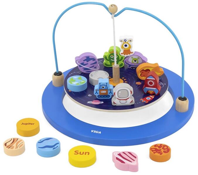 Ez egy űr-témájú kiegyensúlyozó játék. A gyerekek úgy játszhatnak ezzel a készlettel, hogy hasonló súlyú blokkokat keresnek, és úgy helyezik el őket a megfelelő helyen, hogy egyensúlyban maradjanak, és ne essenek le. A játékkészlet a következőket tartalmazza: a Nap, 8 bolygó és 7 egyéb űr témájú blokk. Az egész játék bükkfából készült, és ártalmatlan fest