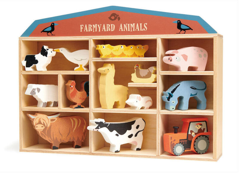 Tervezte és készítette a Tender Leaf Toys Beee, múúú, uííí – Üdvözöljük a farmon! Tökéletesen illeszkednek a kicsi kezekbe, ezek a gyönyörű tanyasi állatok, melyek egy rekeszes fapolcon találhatóak. Így szépen, rendben tarthatóak a szoba falán. Fenntartható forrásból származó gumifából készült, ez egy teljesen műanyagmentes tömörfa környezetbarát játék! M