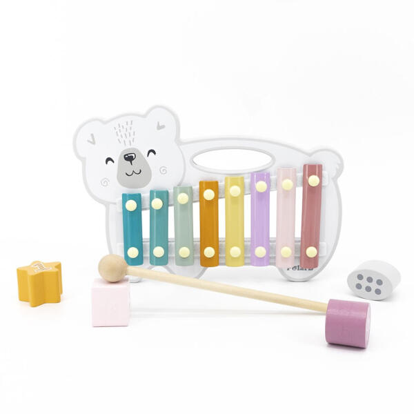 Mackó minden gyereket meghív egy zeneórára! Csak koppints könnyedén a fémlemezekre, hogy meghallgasd a harangok gyönyörű hangjait. Az egész termékcsalád lakkozott fából készült, és nem mérgező festékekkel "poláris" színekkel festették le, hogy minden felhasználó elégedett legyen, és sok szórakozást nyújtson. Elsődleges szempontunk a termékeink biztonsága és minő