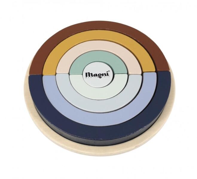 Magni szivárvány kirakó fából kör alakú kirakó tálcán pasztell színben Készíts labirintust, piramist, girbe-gurba utakat, kerítést vagy bármilyen kreatív építményt ezekből a csodálatos színű, egyre növekvő méretű, egymásba forgatható félkör építőelemekből. Építsd össze őket fakockákkal és egy impozáns kastély emelhető a gyerekszobába. Magni dán gyárt