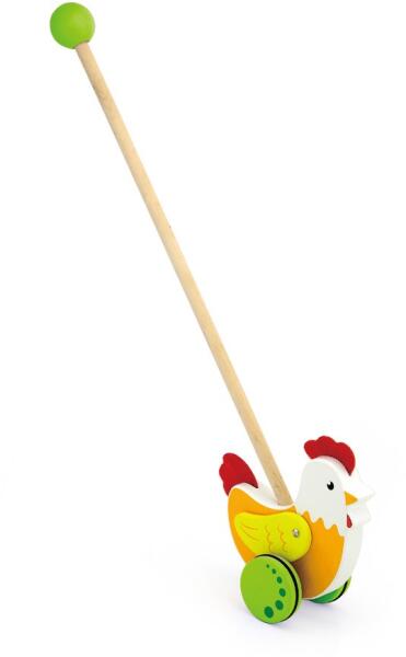 Szép tologatós fajáték Viga tyúkocska gyermekek számára. Tökéletes oktatási játék. Ideális sétáláshoz és othoni játszáshoz. Élvezzen vele sok örömet és szórakozást. A kerekeken található gumi, vicces módon utánozzák az állatokat. A játék segíti a gyermekeknek megismerni a formákat és színeket. A játék festett fa. Kiemelt fontosságúnak tartjuk a biztonságot