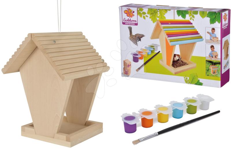 Fa madáretető Outdoor Feeding House a német Eichhorn gyártótól gyerekeknek 6 éves kortól. A madáretető elsőosztályú hársból készült és tapintásra nagyon kellemes. A Rakd össze és fesd ki kreatív készletben egy ecset és 6 festék található, melyek segítségével a madáretetőt a gyerekek saját fantázia szerint festhetik ki. A kreatív játék hosszan tartó szórakozá