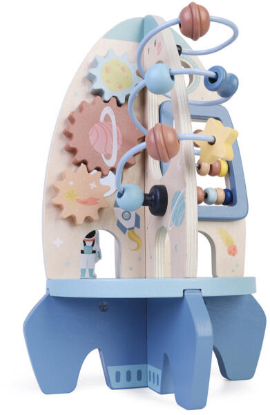 A rakéta különféle játékelemeket tartalmaz, amelyek szórakoztatják és tanítják gyermekeit. A labirintusban színes gyöngyöket csúsztathatnak végig a cikk-cakk dróton, ami fejleszti finom-motorikát és szem-kéz koordinációt. A csúszó fogaskerekeknek köszönhetően a gyerekek megismerkednek az ok-okozat elvével. Mozgathatják a golyókat a pulton, hogy gyakorolják a térbeli